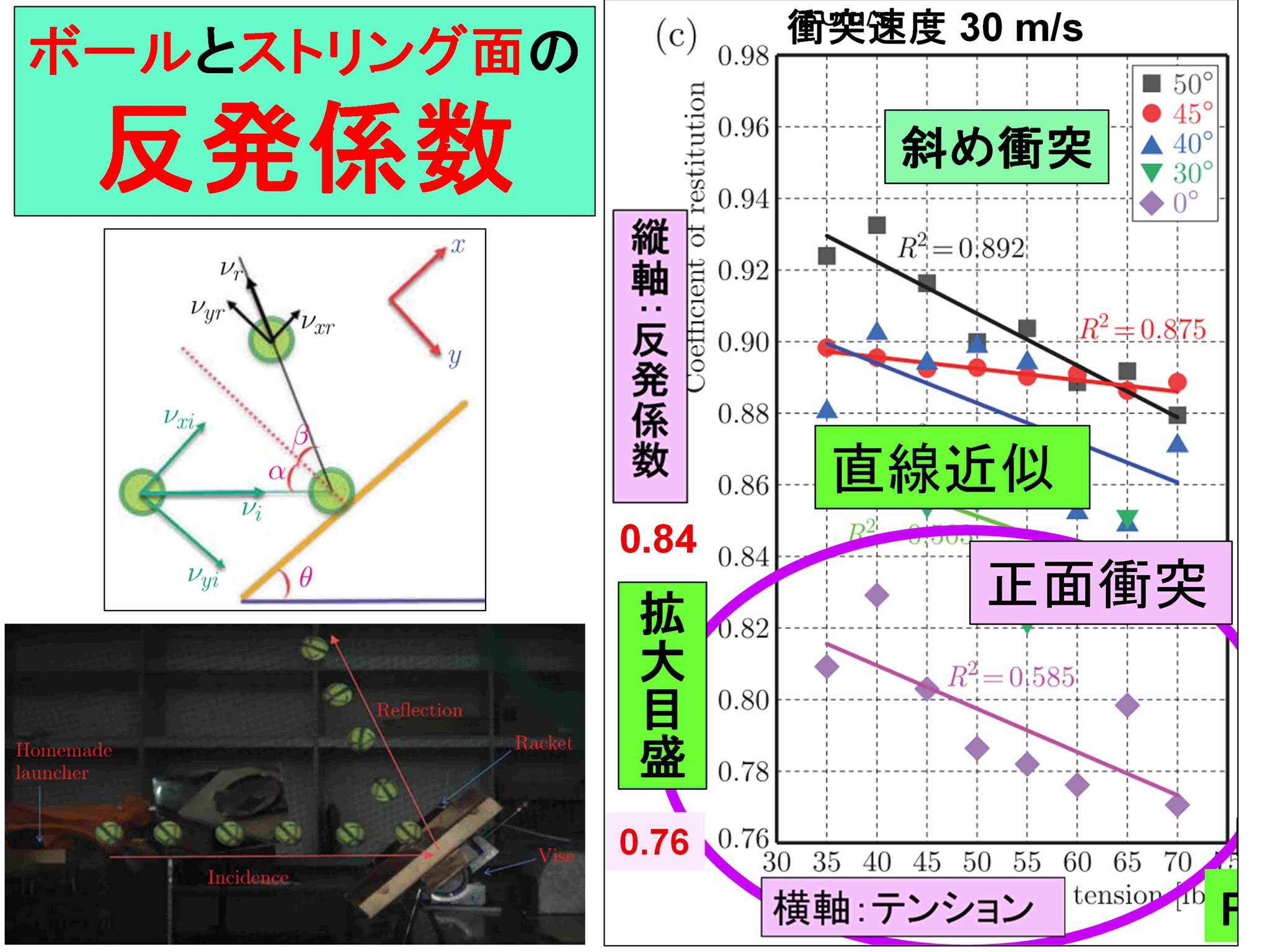 ・“35ポンドから70ポンドまで8種類の(張り上げ)テンションについて、ラケット・ヘッドを固定して、ラケット・ヘッドの幾何学的中心に、角度を変えて、テニスボールを射出して斜め衝突させた実験において、テンション 40 ポンドが最も高い反発係数(COR)を示し、張力 70 ポンドは相対的に低い値を示した”