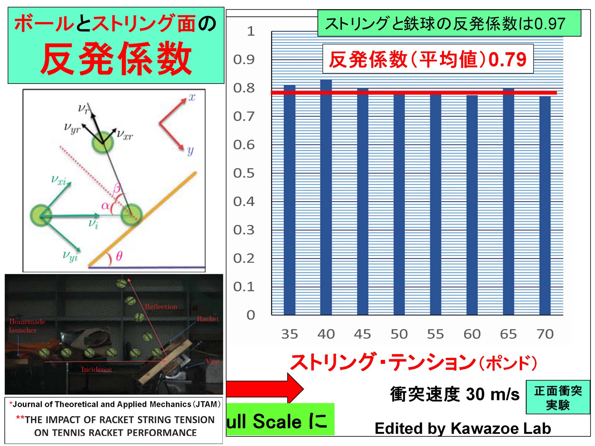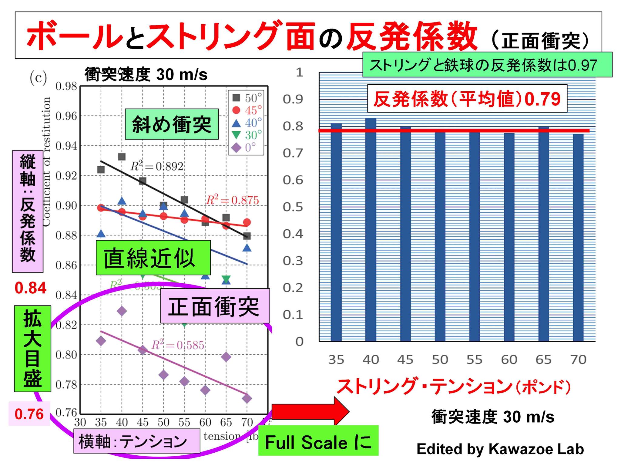 平均値が0.79 でバラツキの範囲が 0.77 ~0.83、 あるいは「ボールとストリング面の反発係数は約 0.8程度でバラツキの範囲が0.77 ~0.83、+-0.03」というのが川副研究室の見方・考え方です.