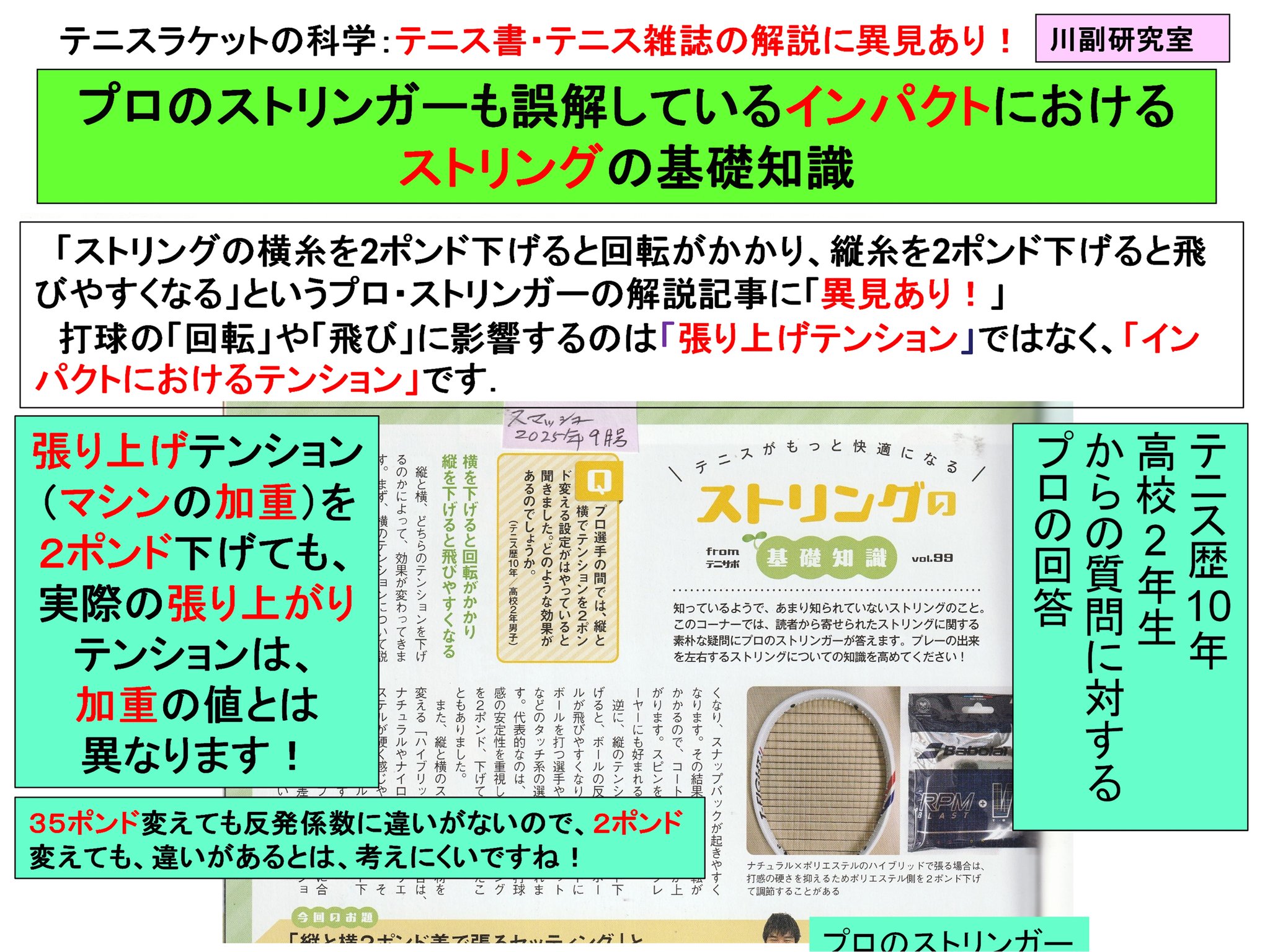 ・(張り上げ)ストリング・テンションを2ポンド下げた場合に、ラケットの性能がどうなるかという高校生(テニス歴10年)の質問に対するプロ・ストリンガーの回答に「異見あり!」です.