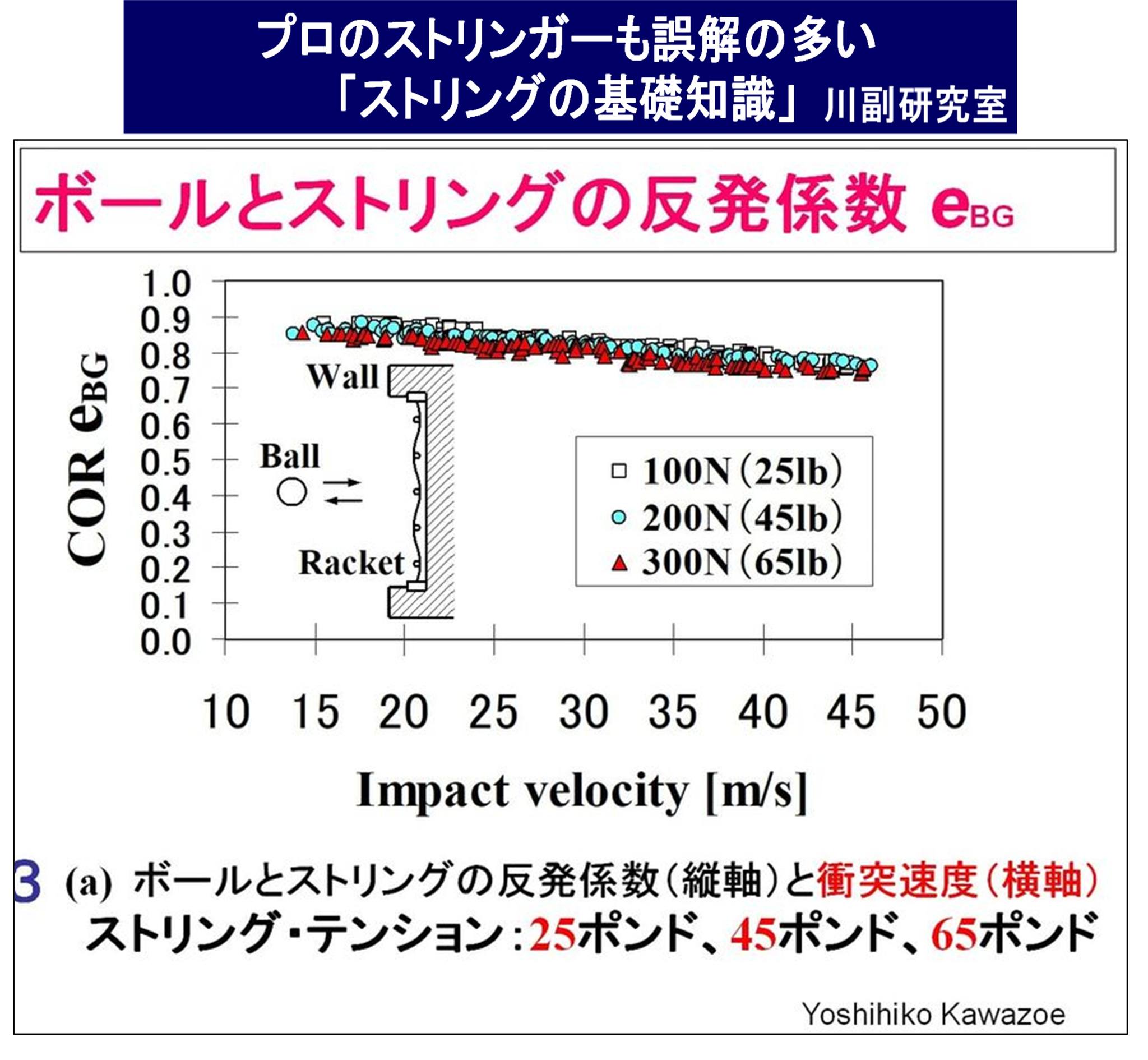 むしろ、衝突速度(ボールとラケットの一般的な衝突速度)が速くなると、「ボールの変形」によるエネルギ損失により、「(ボールとストリング面の)反発係数」は次第に低減します。