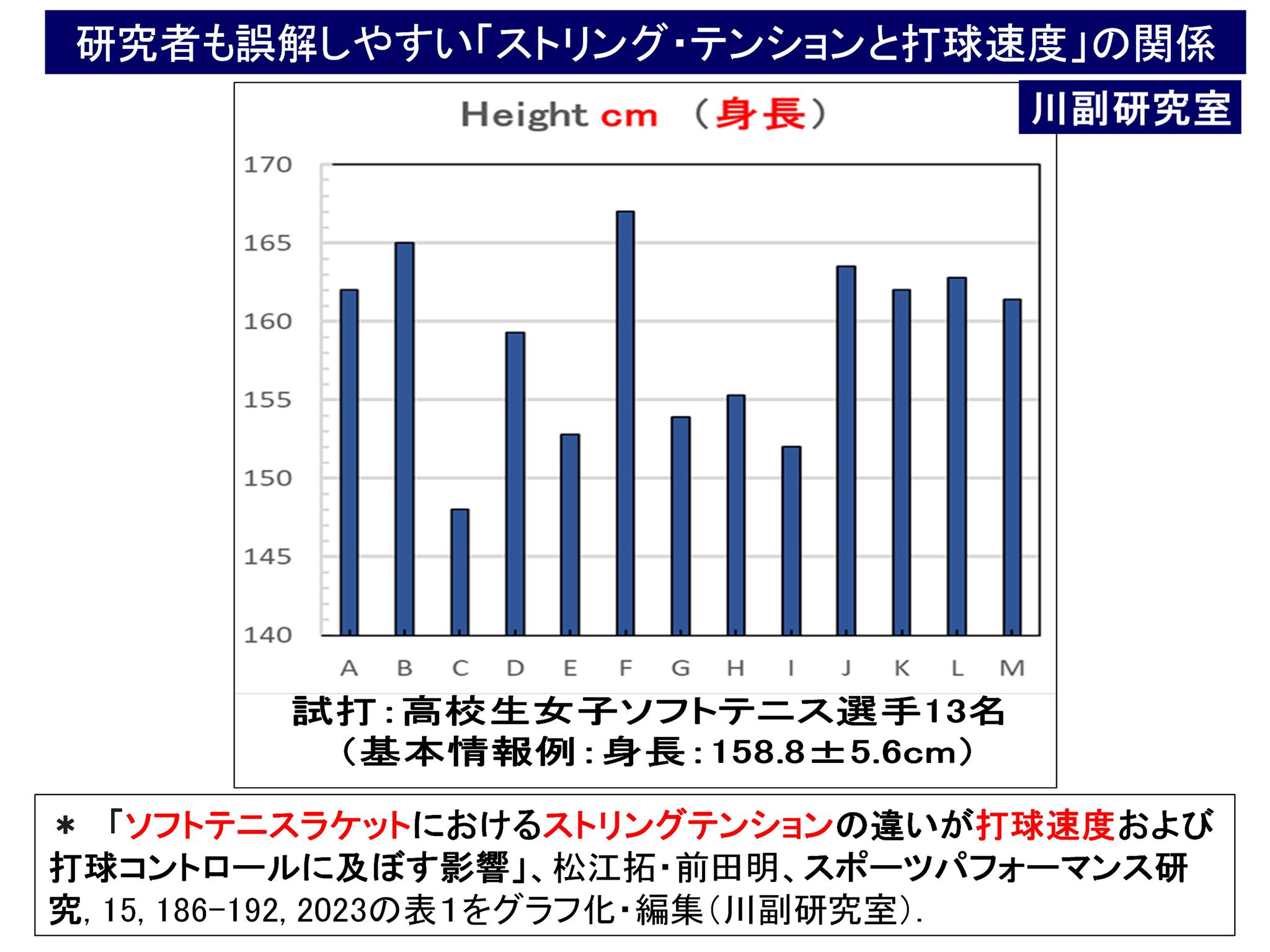 画像3は、引用論文の表1(試打:高校生女子ソフトテニス選手13名、基本情報例:身長:158.8±5.6cm)を川副研究室によりグラフ化・編集させていただいたもので、試行者の身長のバラツキの大きさを示しています。