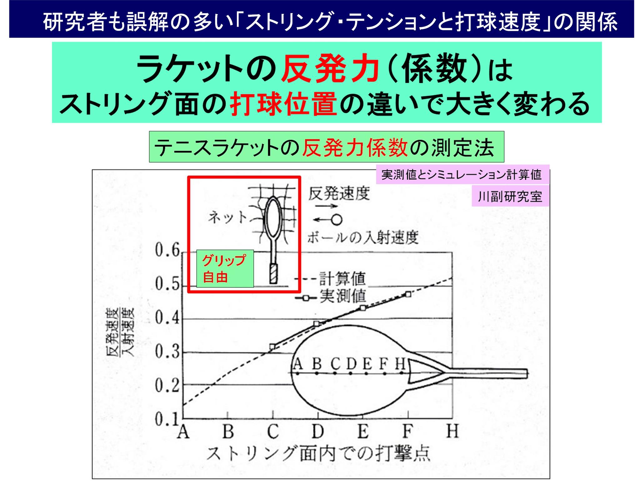 ・ボールとラケットの反発係数(ストリング面中心で約 0.8)とラケットの反発力係数(ストリング面中心で約 0.4)は別物です。