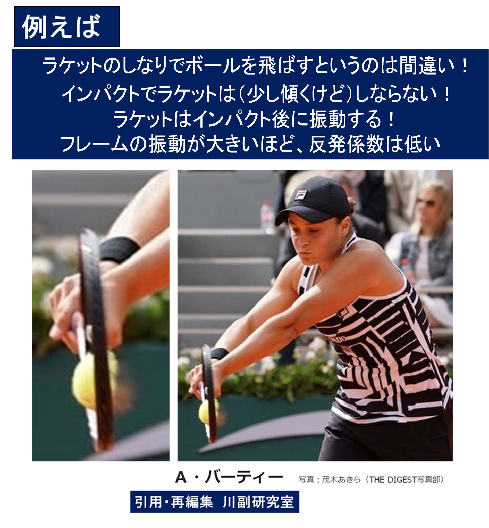 反発性能(ボールを跳ね返す性能:ボールの入射速度に対する跳ね返り速度の比)に関しては、ラケットが木製(動的な硬さを表す固有振動数:100 Hz程度)から複合材料製(130Hz以上)に変わってからは、薄厚ラケットでも、オフセンター打撃でもフレーム剛性(硬さ)は十分です。**