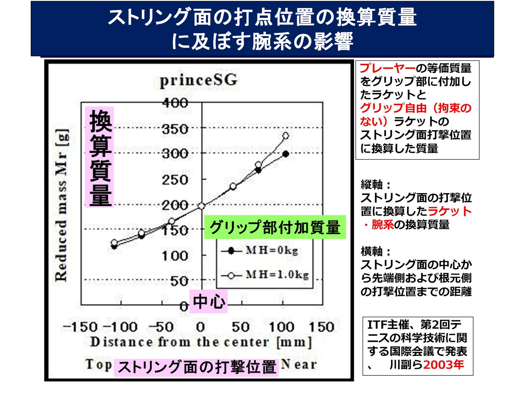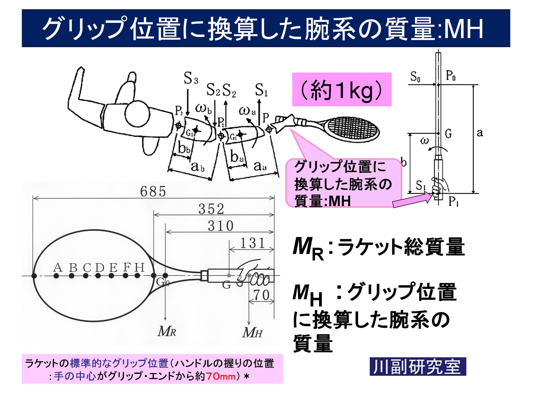 ・腕系の質量をラケット・グリップの握りの位置に換算すると、一般的なプレーヤーの場合、おおよそ 1 kg です。