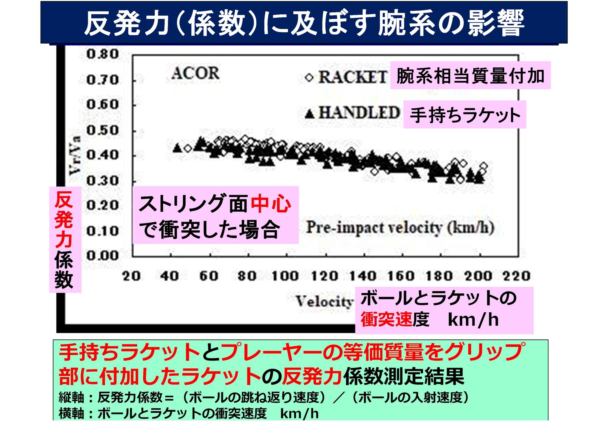 ・ボールをラケット面の中心に衝突させた場合の両者の反発力(係数):実験結果は、良く一致している。