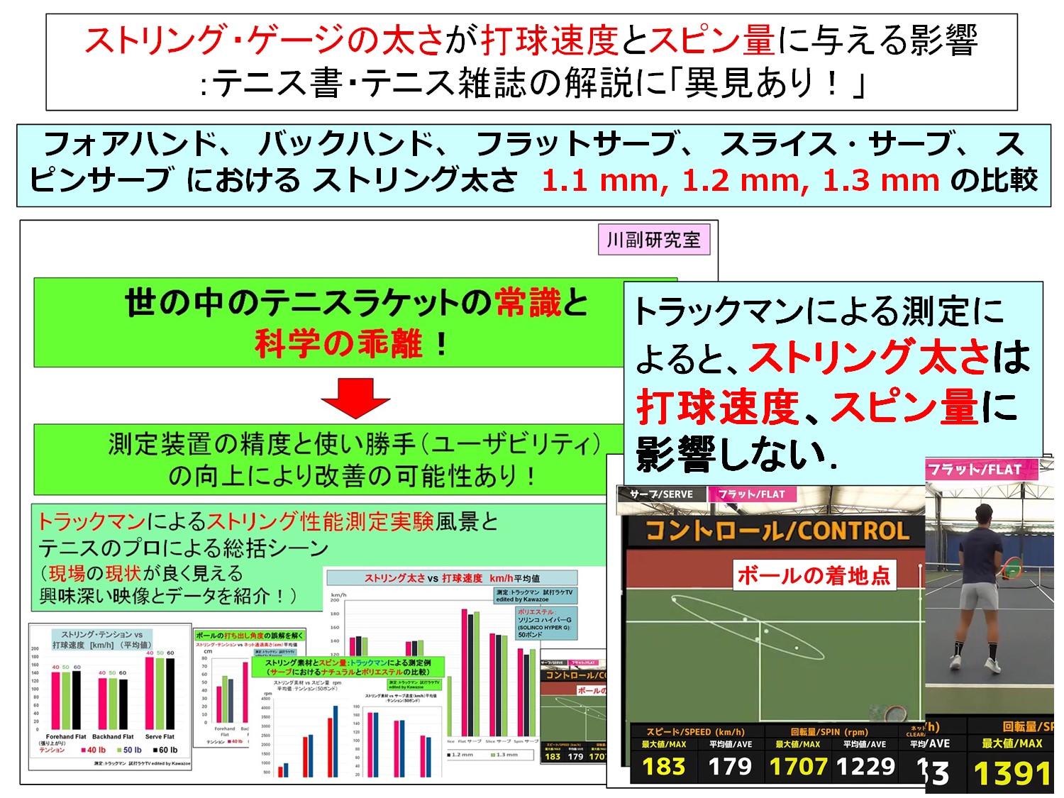 :トラックマンによる測定によると、フォアハンド、バックハンド、フラットサーブ、スライス・サーブ、スピンサーブにおける1.1 mm、1.2 mm、1.3 mmの実験データが示すように、ストリング素線の太さ(ゲージ)を110、120、130(単位0.1 mm)に変えても、打感は異なっても、「打球速度」と「スピン量」への影響はありません.